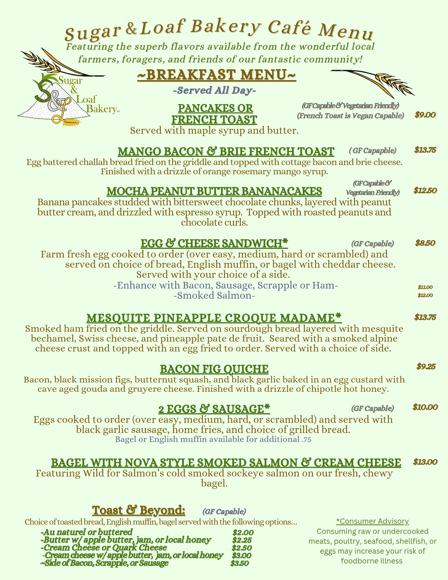 Full of local meats, cheeses, produce, and more all with a seasonal flair! Many of the menu items can be made gluten free, as well as some vegetarian and vegan possibilities. On weekends Chef Phillip puts together some of his exclusive creations for a specials menu. Menus change every 6-8 weeks so be sure to check back often to see whats new!